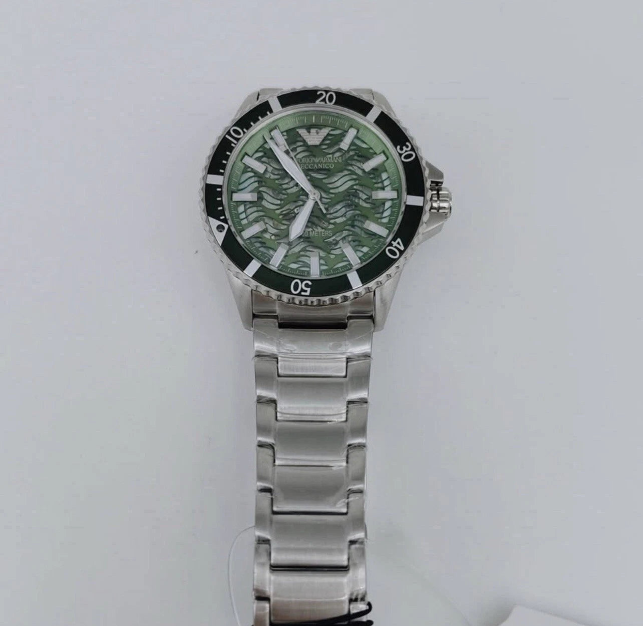 Emporio Armani's 42mm watch features a green sunray with cut out dial, at least 50% recycled stainless steel case, automatic movement and at least 50% recycled stainless steel bracelet.